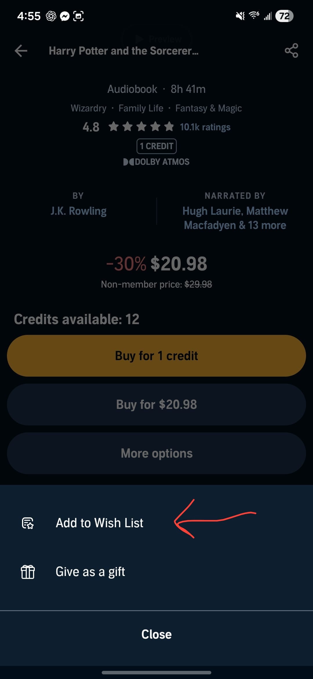 Wishlist is not an edge case feature. It is a core expression of user intent. It signals interest without commitment. It fuels future purchases. It supports browsing behavior. It even signals to Audible which books they should recommend to users.
