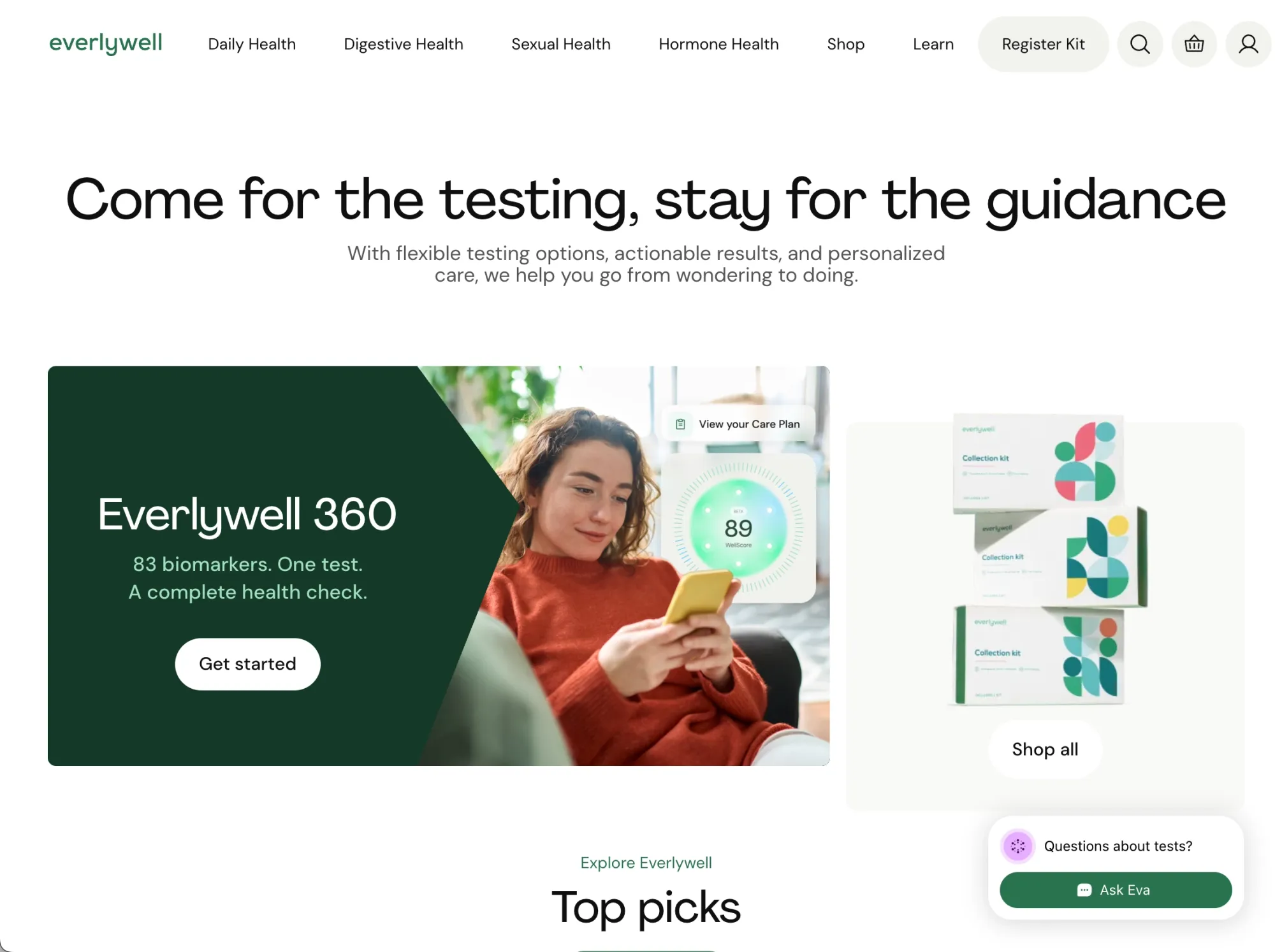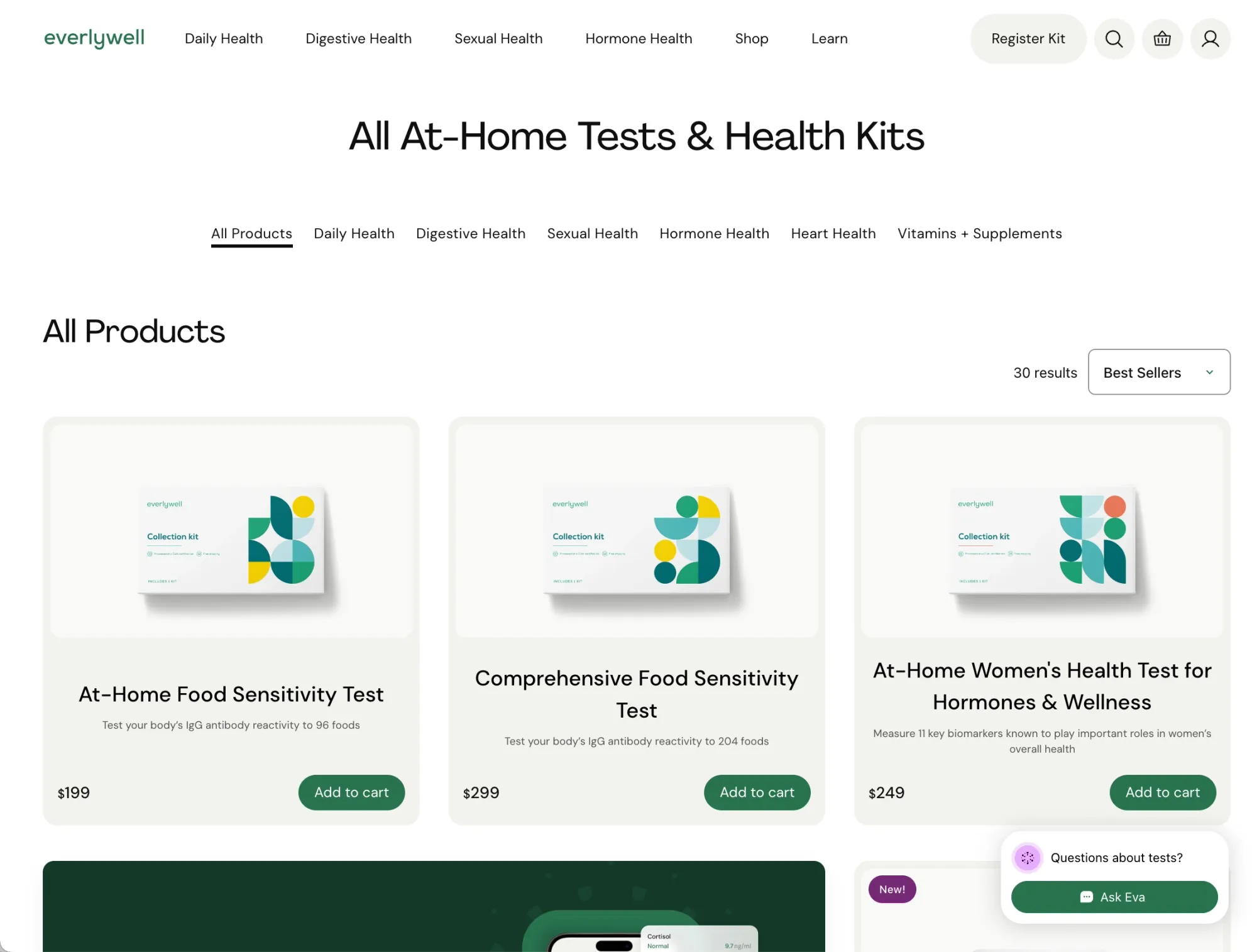 Below are some of the categories and offerings from Everlywell’s shop. Exact bundles, names, and pricing can change, so check their website for more up to date info: