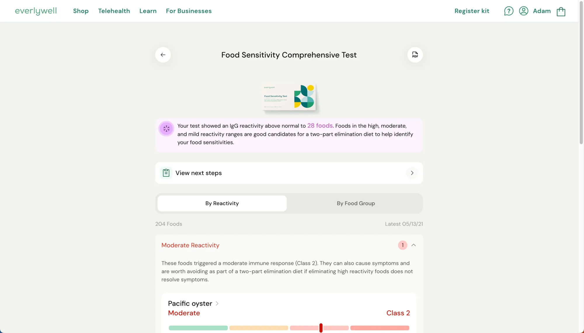 - Results & Readout: My dashboard posted results in about a week. The report ranks each food Class 0–3 and I had 28 flagged foods across mild + moderate tiers. The most actionable insight was Pacific oyster—the only seafood in my high/moderate tier (Class 2). I also had one mild seafood hit (clam, Class 1). Oysters map perfectly to my lived experience (they trigger 12–24 hours of flu-like symptoms), so cutting them was a clear win.