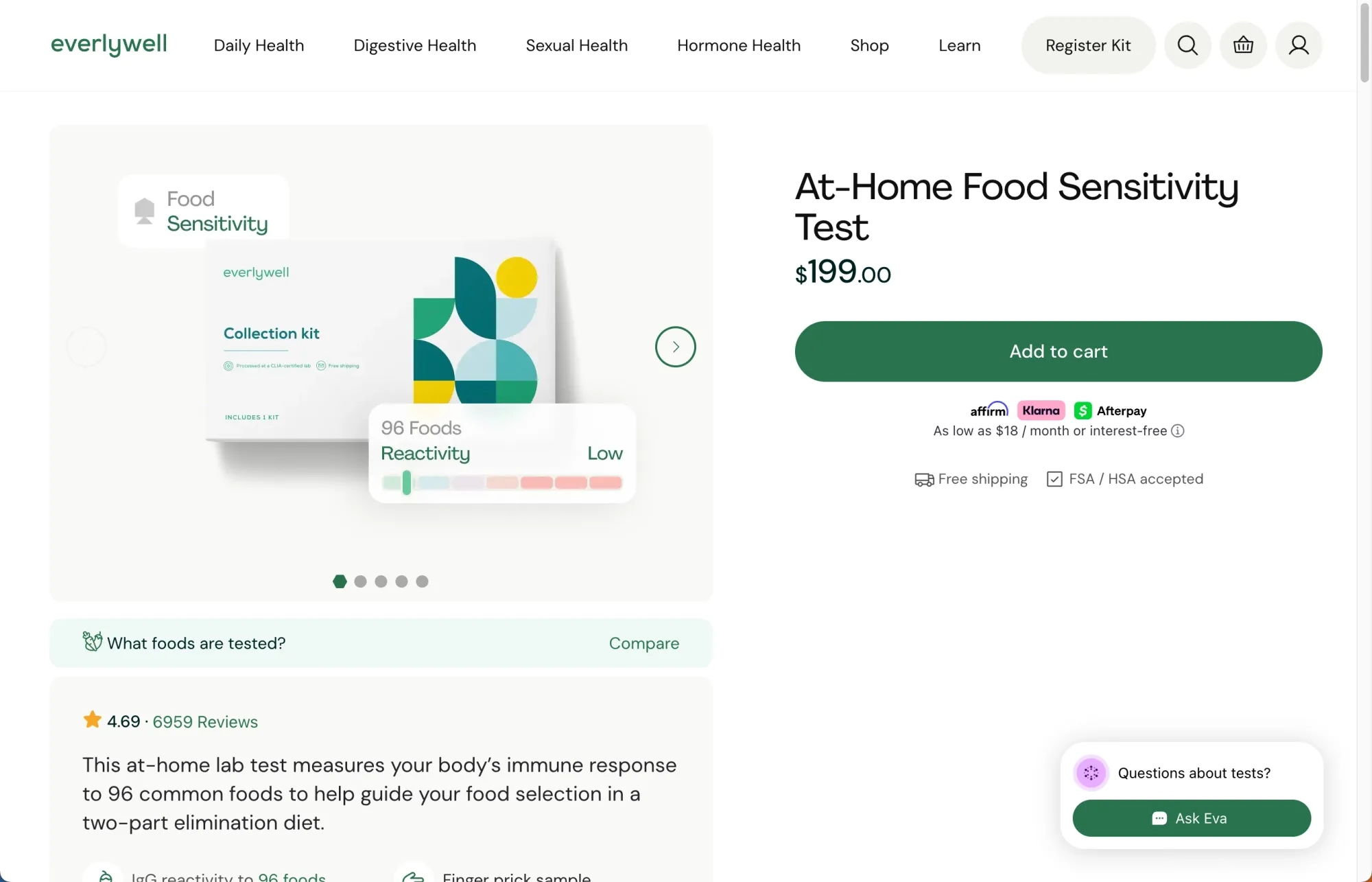- Food Sensitivity Comprehensive Test (204 foods): typically $299 list price on the Everlywell site; the 96-food version is less. FSA/HSA eligibility is common; traditional insurance varies but shouldn't be expected.